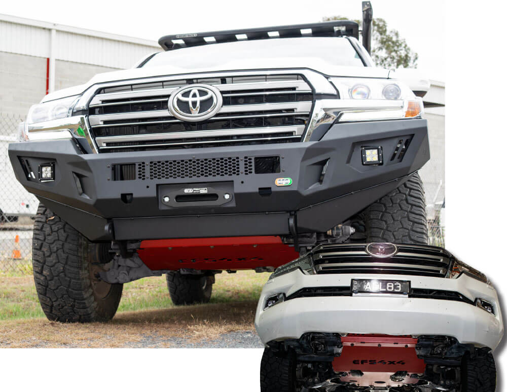 The EFS EUB-TOY04-1 front under-body skid plate is precision-cut for the Toyota LandCruiser 200 Series when fitted with the EFS X-CAPE or Stockman bullbar, offering heavy-duty steel protection for the vehicle’s underside in off-road and towing scenarios.