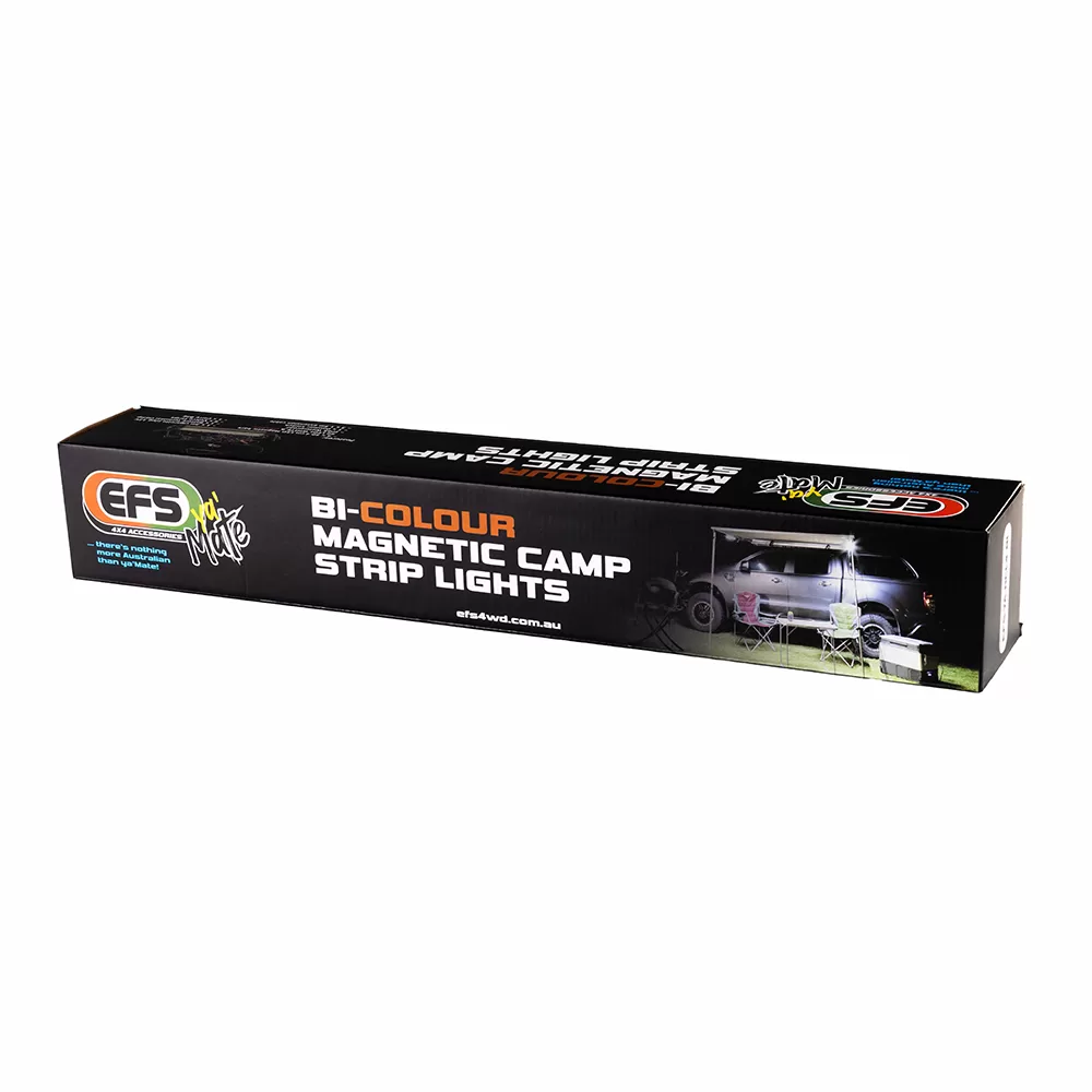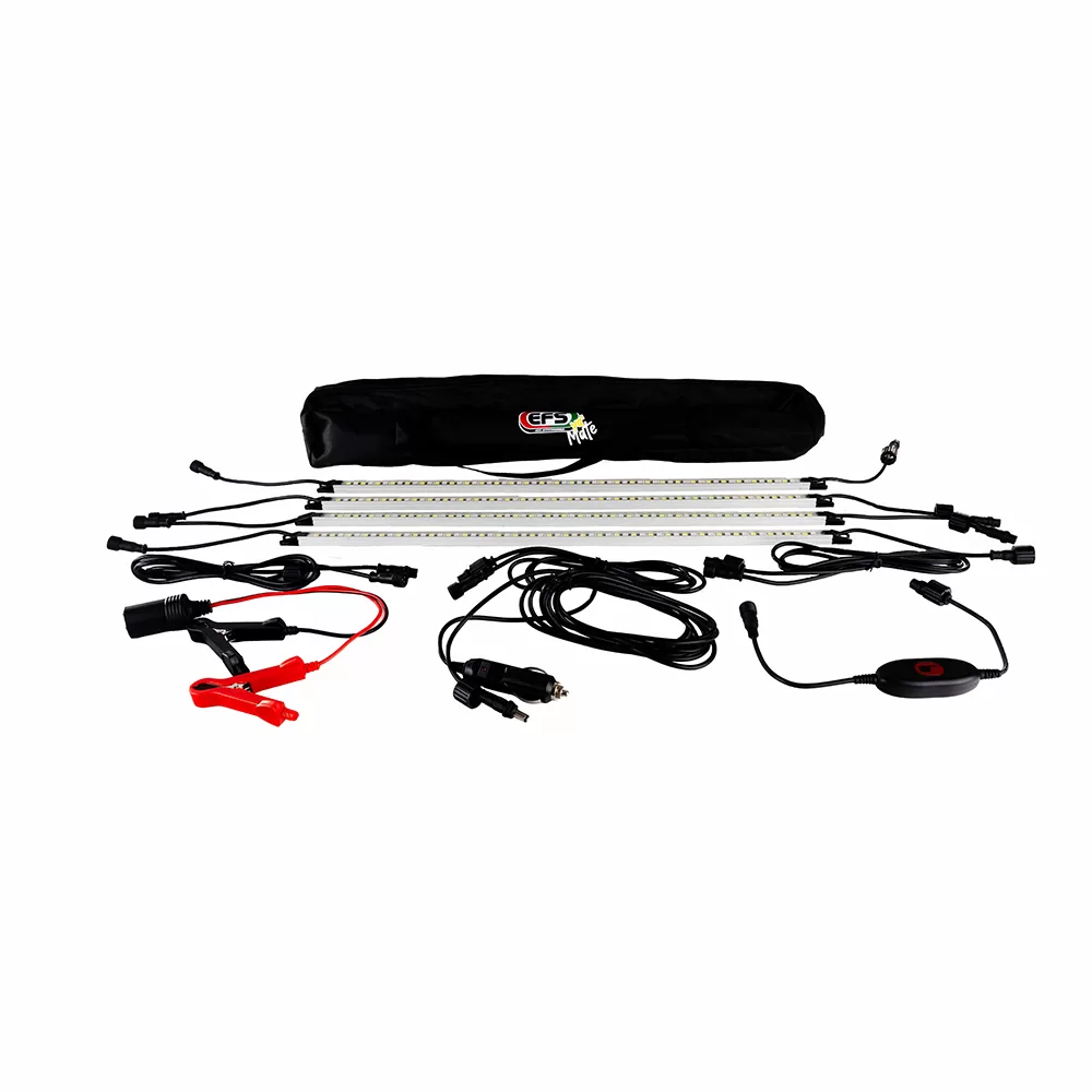 Whether you’re lighting up your vehicle drawer, campsite canopy or workshop tray, the EFS YA-RCL4-BI kit gives you premium flexible lighting in a compact, ready-to-install package. It includes four magnetic bars, each with 60 LEDs, offering full white output for work mode or amber output for low-glare and bug-reduced ambient lighting. The bars are secured with strong magnets, and everything is housed in a carry bag with accessory cables, battery clamp and 12 V plug for quick setup.